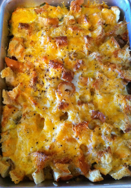 4. Sprinkle half the cheese, half the meat, and half the veggie mixture over the bread cubes.